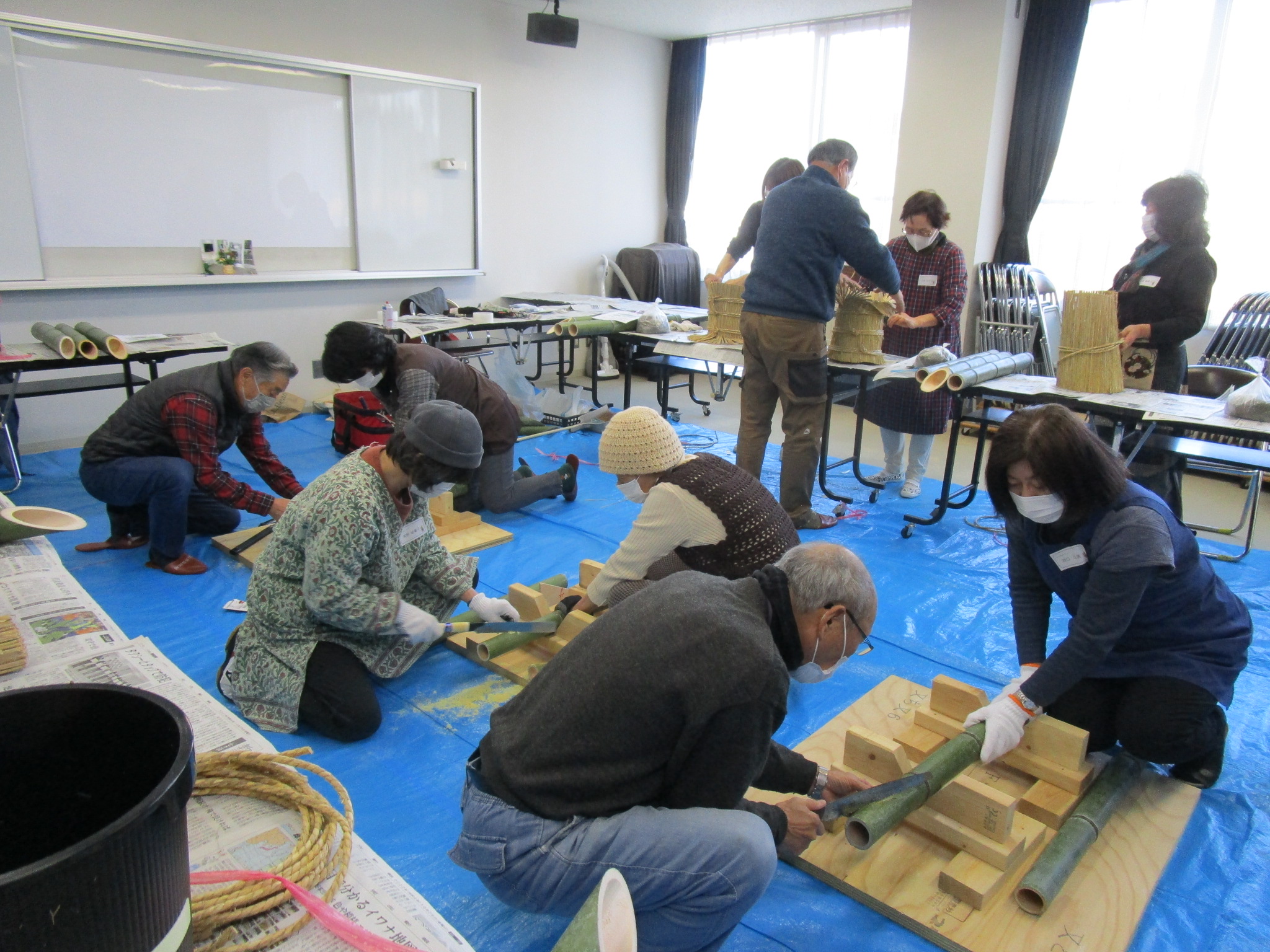 講師に那智が丘在住の馬場 文雄氏をお迎えして竹の門松づくりをしました。まず竹3本を斜めに切り、土台になる部分にこもを巻き、そして縄を3段に巻いて男結びをします。この男結びがとても難しく講師にサポートしてもらう方もいました。
