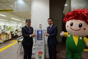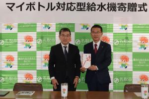 この度、名取市管工事業協同組合様より設立10周年記念事業として、市役所庁舎1階中央階段脇にマイボトル対応型給水機を寄贈いただきました。今回の寄贈により、マイボトルの普及促進および夏季の熱中症対策の啓発に資するものとして、積極的な活用を進めてまいります。