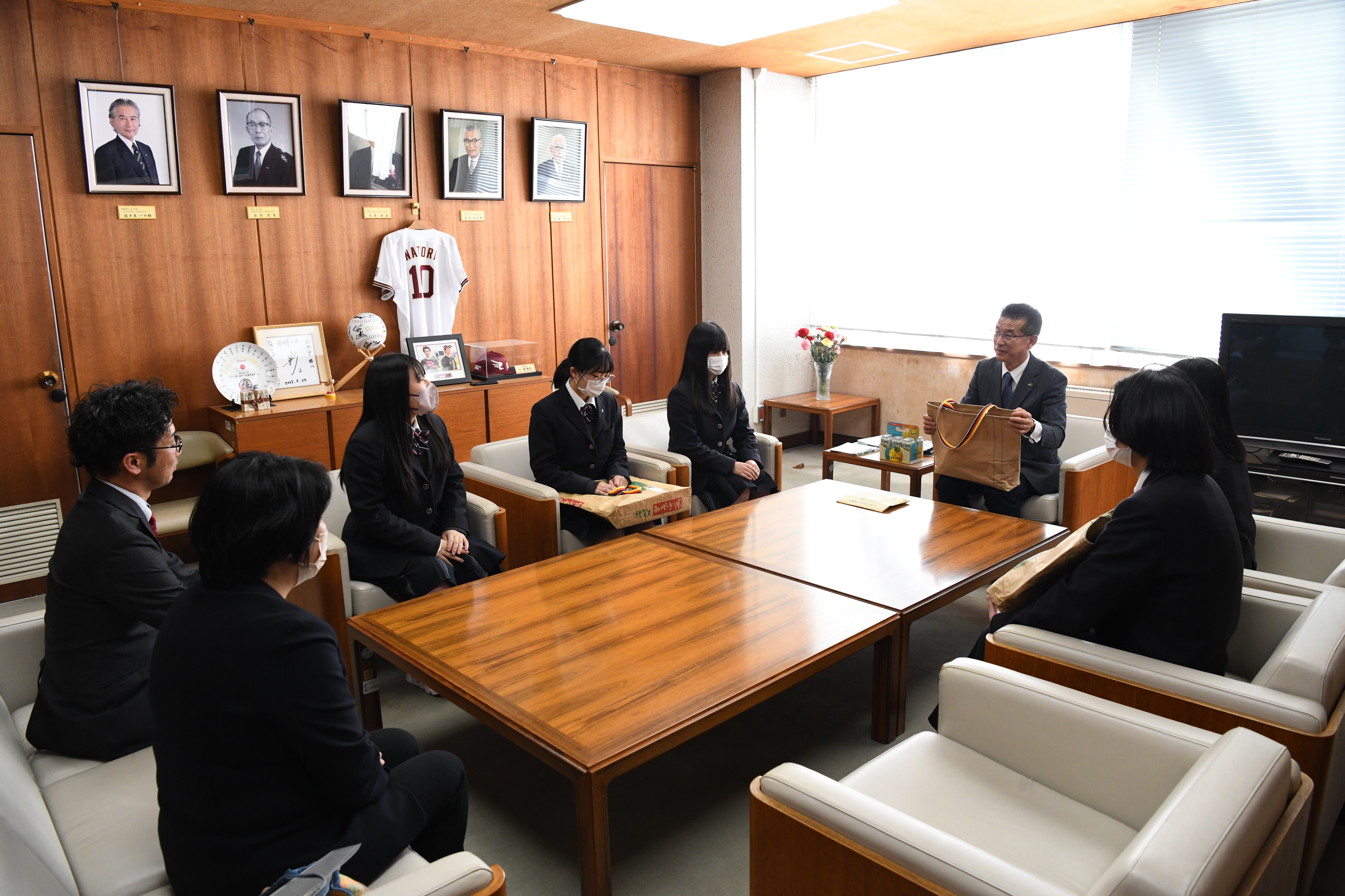 (令和6年2月2日)宮城県農業高等学校生活科の生徒様より能登半島地震被災地への義援金を受け取りました。この義援金は、生活科の皆さんが資源の有効利用などを目的としたSDGsの一環として、米袋を買い物バックにリメイクする活動を行い得た収益金です。日本赤十字社を通して、被災地へお届けします。