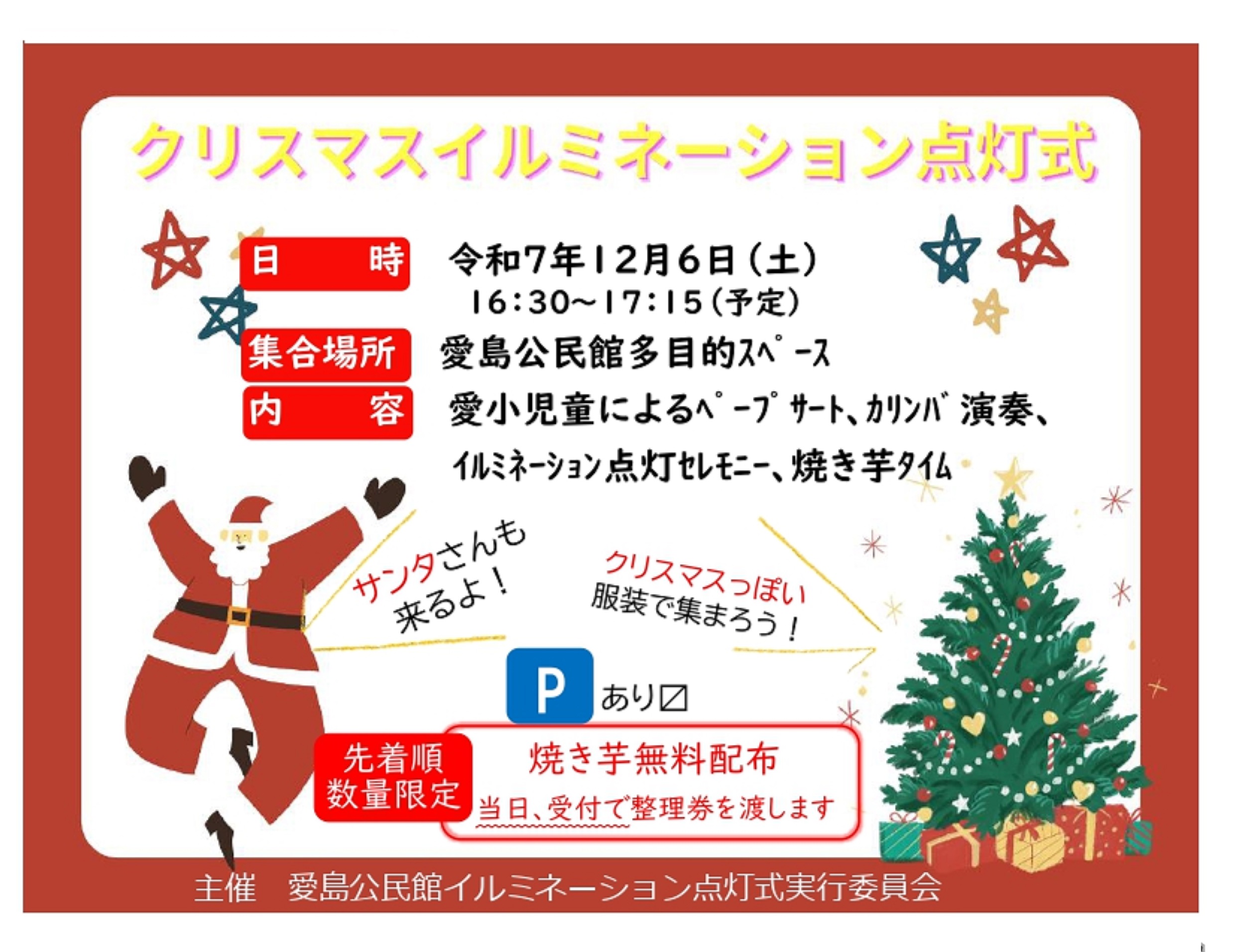 内 容 愛小児童によるペープサート、カリンバ演奏、イルミネーション点灯セレモニー、焼き芋タイム(先着順、数量限定*当日、受付で整理券を配布します)