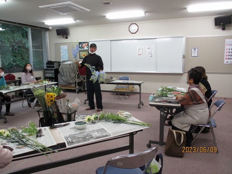 小塚原の花卉生産者 菅井啓貴様を講師に迎え、講師ご自身が生産されたものを中心に10種類以上の花を使って、自由にアレンジメントを楽しみました。お花の名称や特徴のほかに、栽培方法や品種のお話等、生産者ならではのお話をしていただき貴重な時間となりました。名取産のお花といえばカーネーションですが、他にもたくさんの種類が栽培されていることが分かり、名取の花卉生産について知るよい機会となりました。